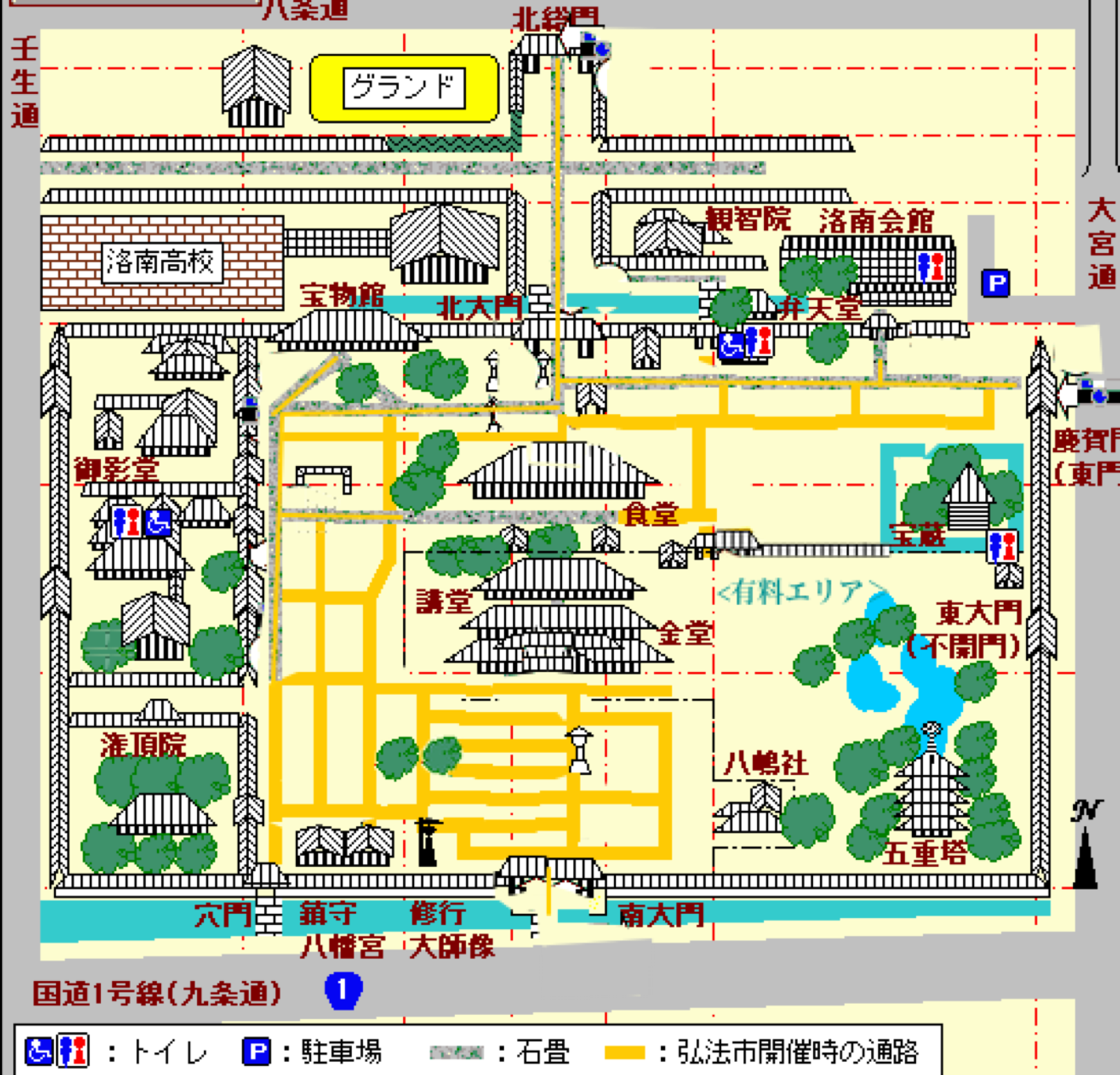 あと敷地内のトイレは五重塔への有料エリア内、洛南会館内とその会館前、西の御影堂の南 でも一番の